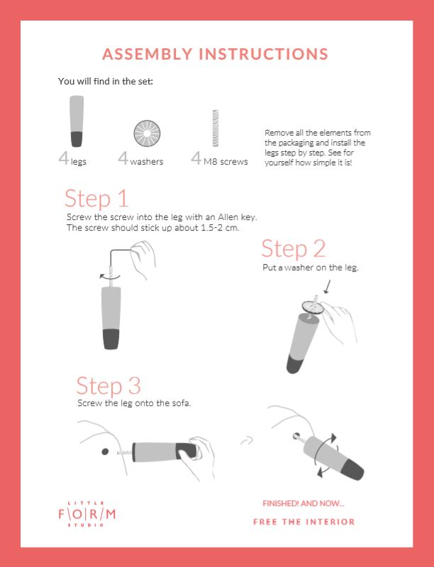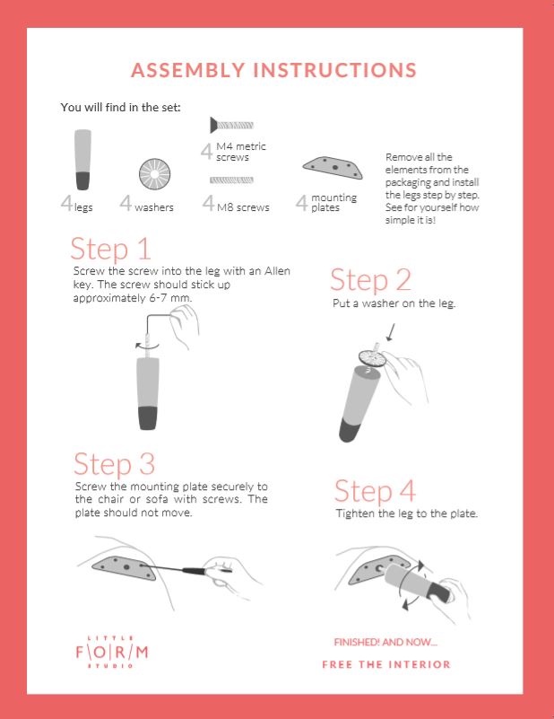You just need to unscrew the legs from your couch or armchair and screw in New.